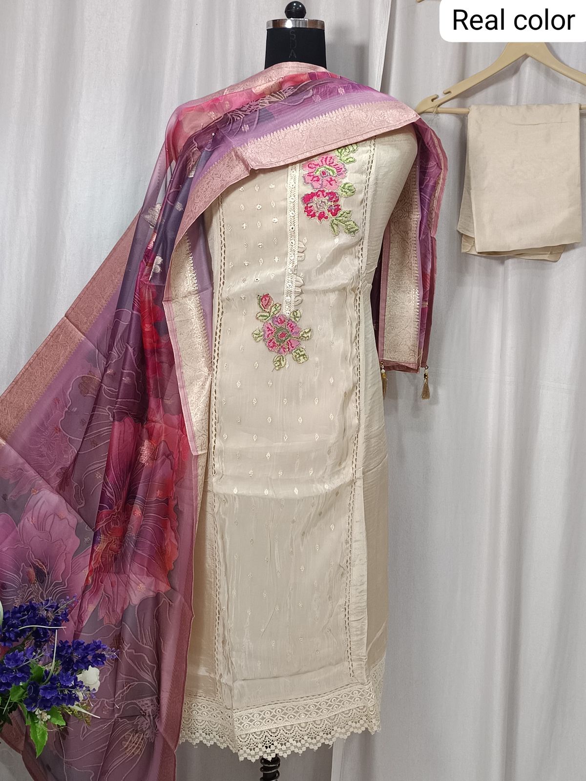This elegant cream suit features a pure shimmer Banarasi shirt highlighted with floral embroidery and lace detailing. The set includes a soft shantoon bottom and a beautifully printed organza dupatta in shades of pink and purple, finished with Banarasi-style accents. Ideal for festive wear and elegant gatherings.