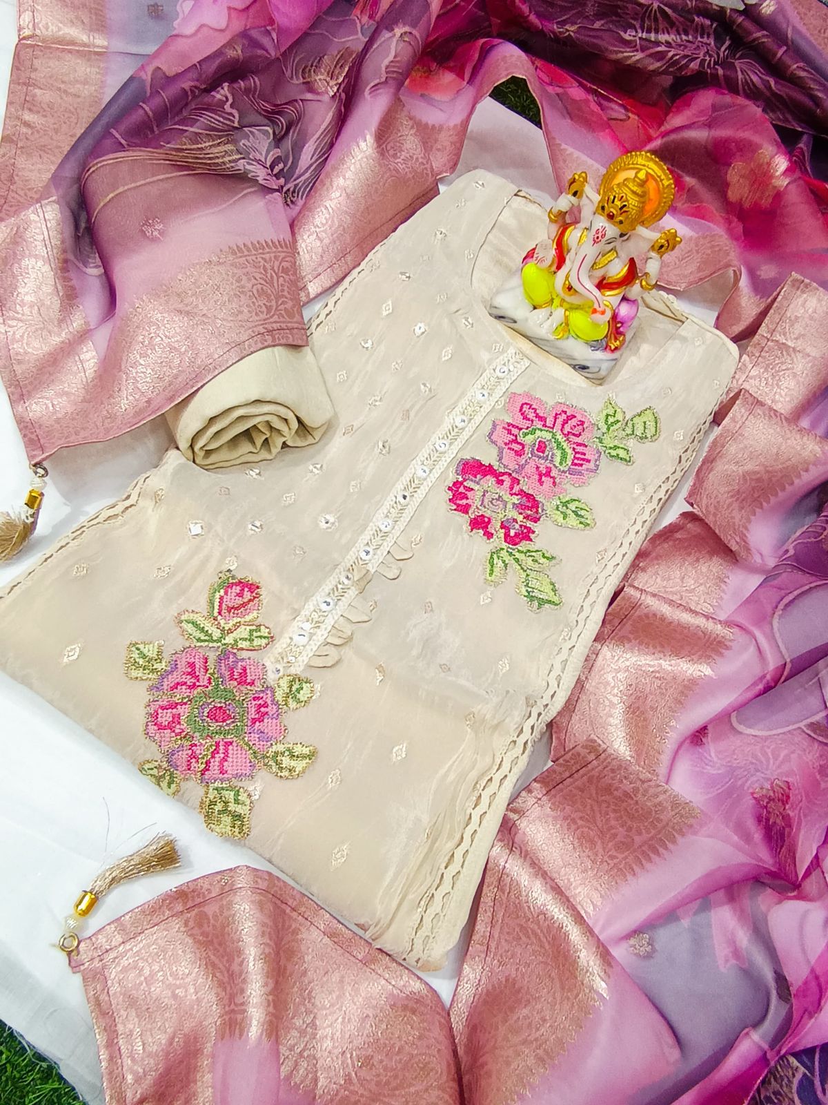 Cream Shimmer Banarasi Suit with Embroidery and Floral Organza Dupatta